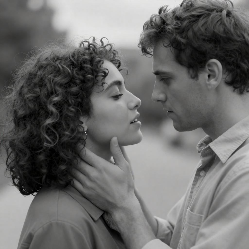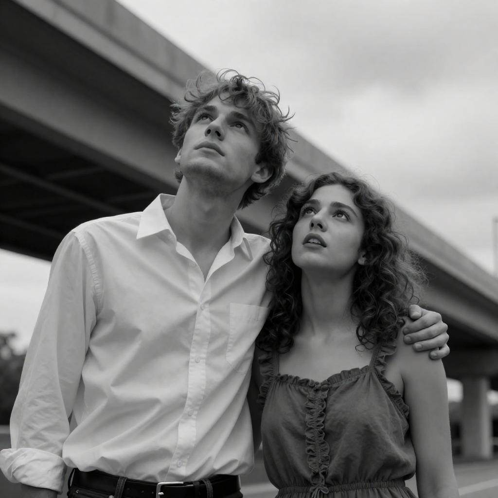 Black and white photo of a young man and woman standing closely under an overpass. The man has tousled hair and wears a loose white shirt with rolled-up sleeves, while the woman has curly hair and wears a ruffled sleeveless dress. Both subjects look upwards with serious expressions. The overpass structure is visible in the background along with a cloudy sky.