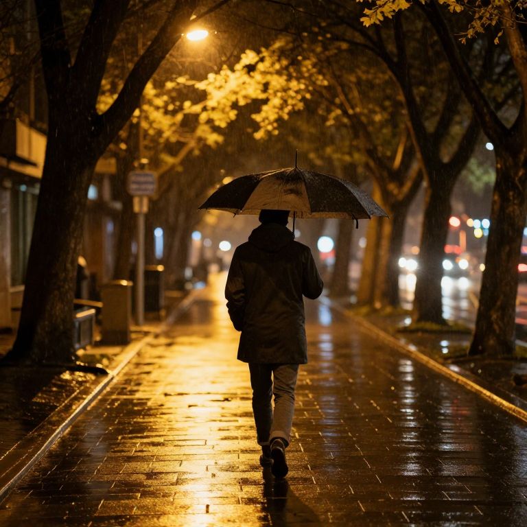 A solitary figure walks down a rain-soaked street, holding a black umbrella aloft as golden lamplights flicker warmly along the wet pavement, surrounded by towering trees and distant blurred lights.