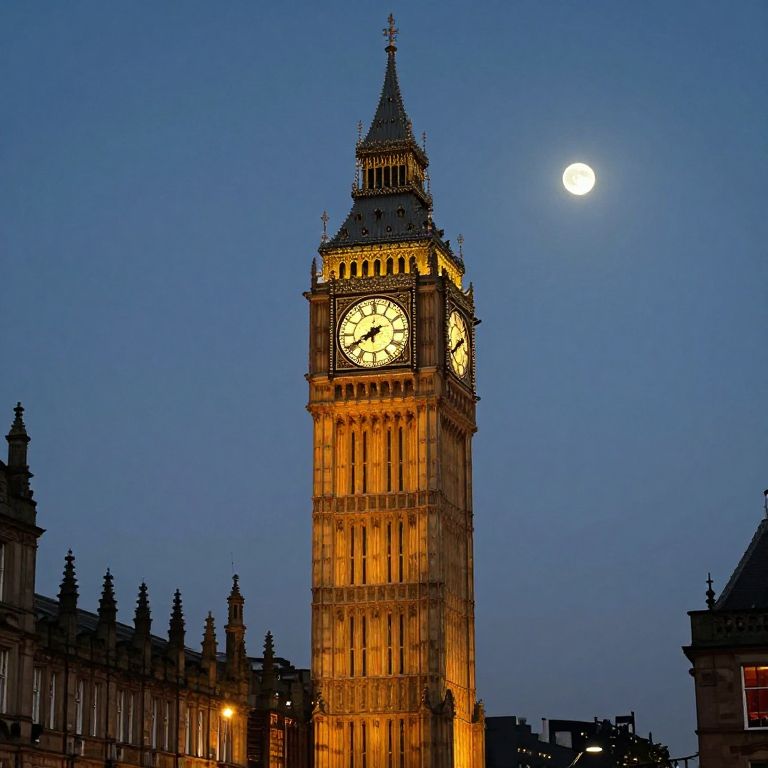 Illuminated clock tower stands majestically against a twilight sky, its golden face glowing brightly as it casts a soft shadow over the historic buildings that flank its base, while a solitary moon hangs above, casting a serene glow over the scene.
