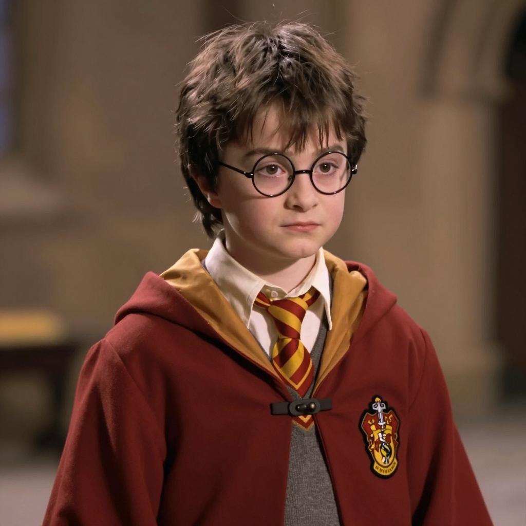 Harry potter toddler, digital image, photograph, child with short brown hair, wearing round glasses, red Hogwarts robe with yellow trim, maroon Gryffindor tunic, badge on chest, standing, serious expression, indoor setting, warm lighting, blurry background, Hogwarts School of Witchcraft and Wizardry, Harry Potter movie style, realistic ures, rich colors, focus on character, realistic lighting, subtle shadows