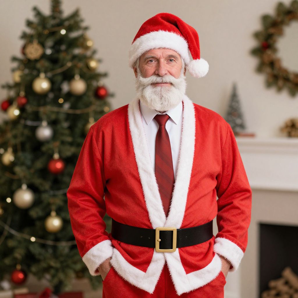 Tailored santa suit costume, 1boy, male focus, solo, hat, santa hat, belt, christmas, facial hair, hands in pockets, beard, christmas tree, necktie, blurry, realistic, old man, blurry background, old, jacket, looking at viewer