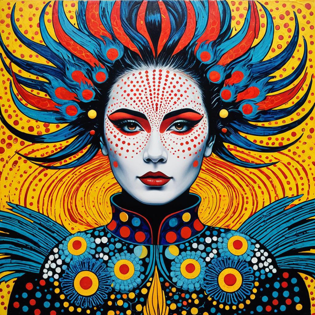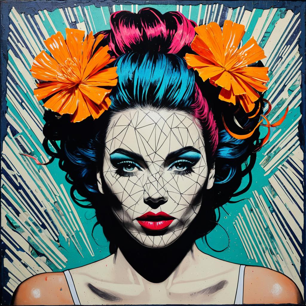 A vibrant, colorful artwork of a female singer with an elaborate, abstract hairdo and striking makeup. The piece features luminescent gradients with intricate shadows on an encaustic-textured surface, combining techniques like decoupage and impasto. Inspired by Enki Bilal and Clementine Lange, the artwork fuses elements of pop art, surrealism, and neon punk to create a bold and energetic composition. The colors are vivid, with a layered, textured finish that evokes a sense of dynamic movement and modern artistic expression.