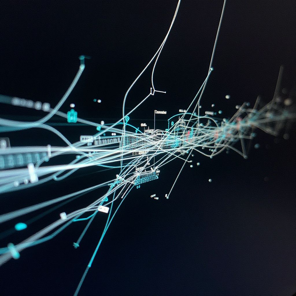 A digital CGI artwork depicts a futuristic, abstract network of glowing white and blue lines and nodes against a black background. The lines, resembling circuit boards or neural connections, crisscross and interconnect in a complex pattern. Small, bright blue dots punctuate the network, adding a sense of depth and dimension. The overall composition is dynamic and intricate, suggesting a high-tech or cybernetic theme. The image has a sleek, modern aesthetic with a focus on connectivity and technology.