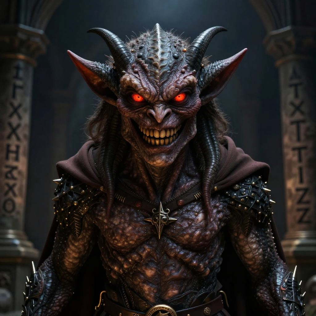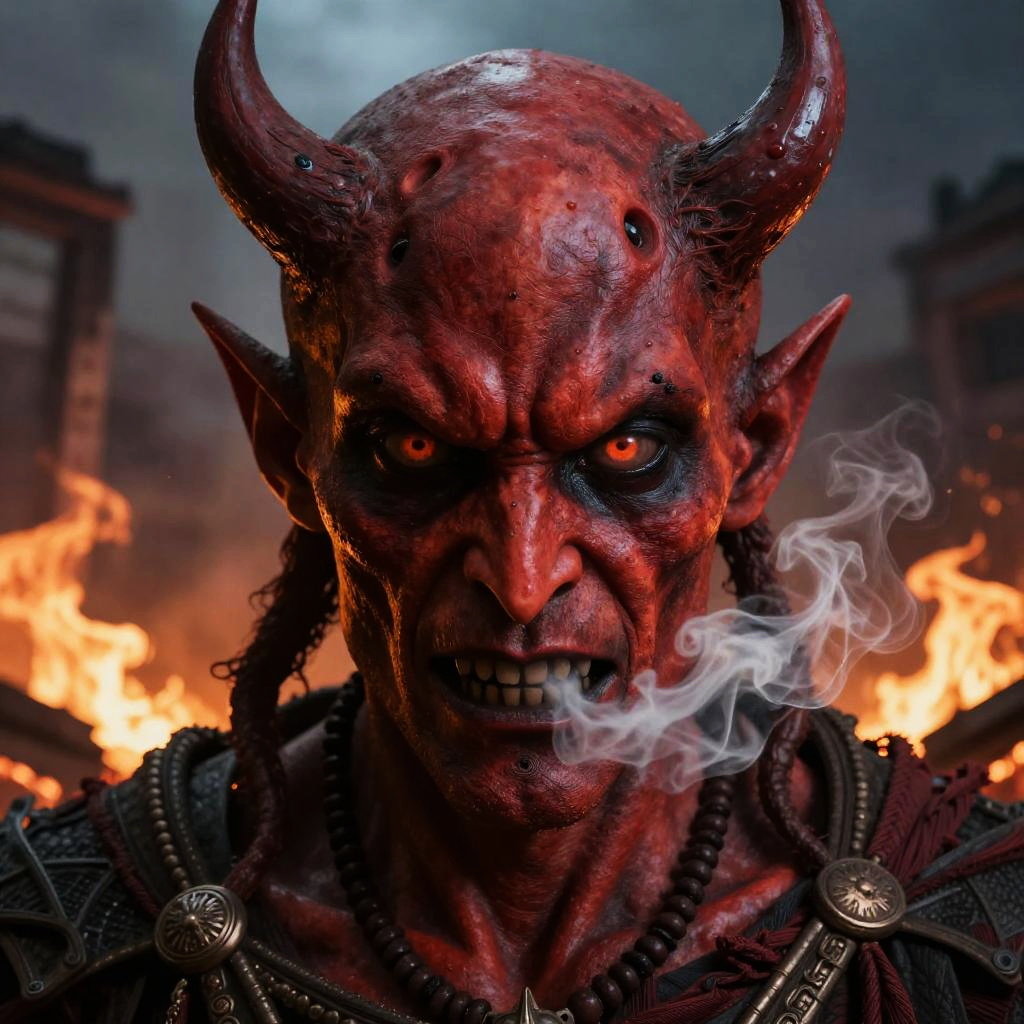 Devil imagery capturing a detailed close-up portrait of a devil with textured crimson skin, piercing eyes, smoke emanating from nostrils, and a backdrop of burning ruins.
