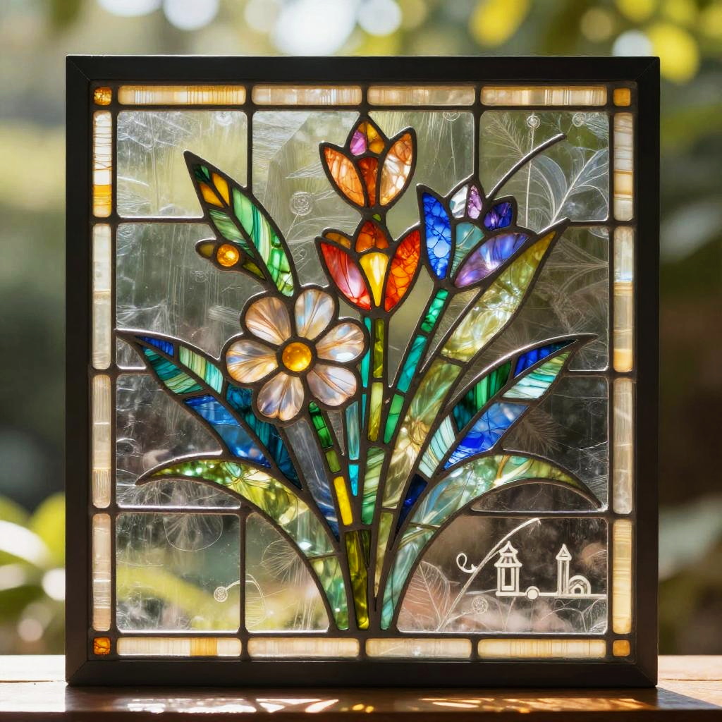 Stained glass filter applied to a serene forest scene, sunlight streaming through multi-colored glass shapes forming a mosaic pattern overlay, enhancing the natural beauty with sparkling translucent textures and vivid color contrasts.