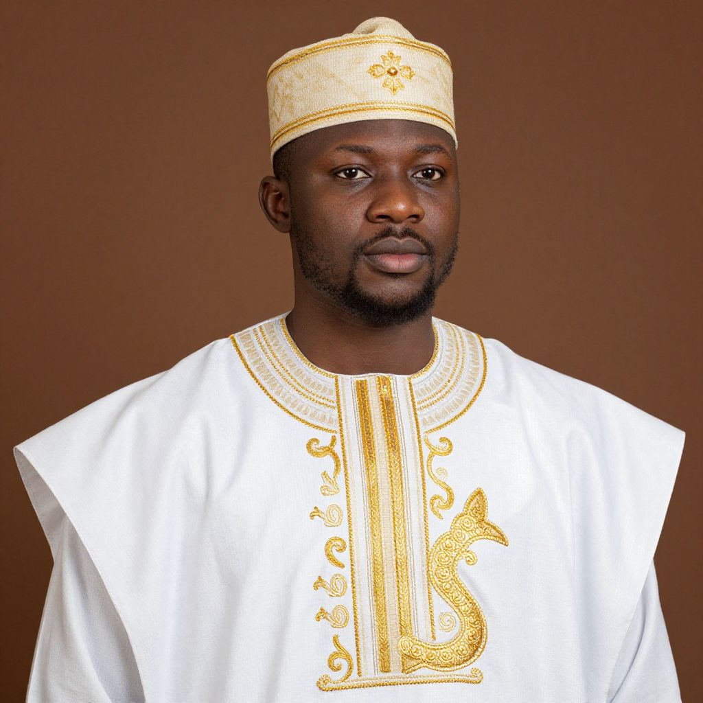 Photograph of a dark-skinned African man with a short beard, wearing a white traditional robe with intricate gold embroidery on the chest and collar. He also wears a matching white and gold embroidered cap. The background is a solid brown color, which contrasts with his white attire. The man's expression is neutral and he is looking slightly to the right of the camera. The texture of the fabric appears smooth and the gold embroidery is detailed and ornate.