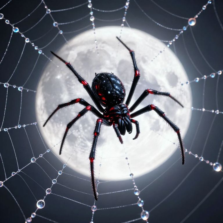 A cyberpunk-inspired digital artwork depicts a sleek, black spider with vibrant red accents gliding gracefully against a luminous moon backdrop, its prismatic web shimmering with crystalline droplets that seem to capture ethereal light, evoking a dreamlike, otherworldly atmosphere.