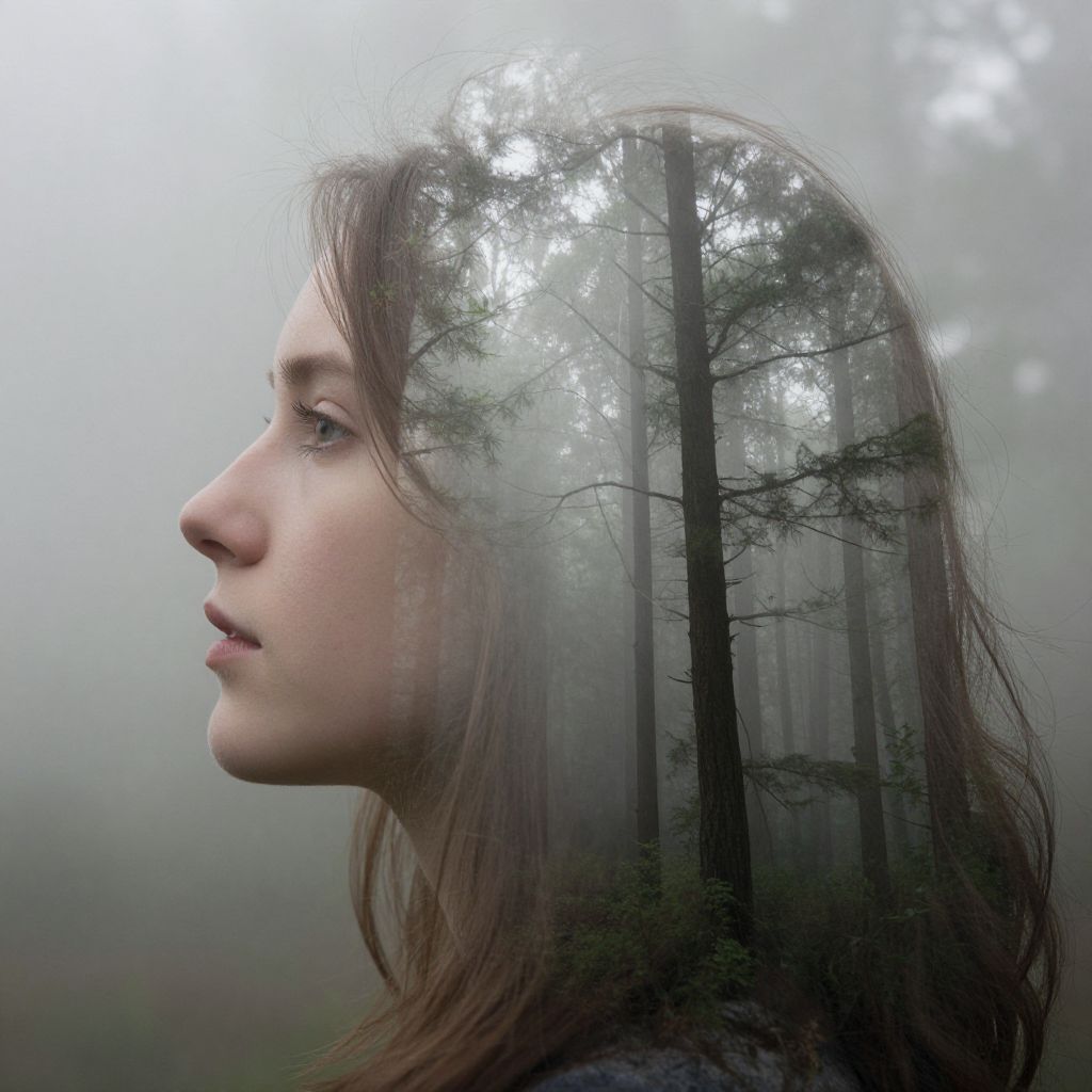 Photograph of a young woman with fair skin and brown hair, profile view, her head superimposed with a misty forest background, tall trees