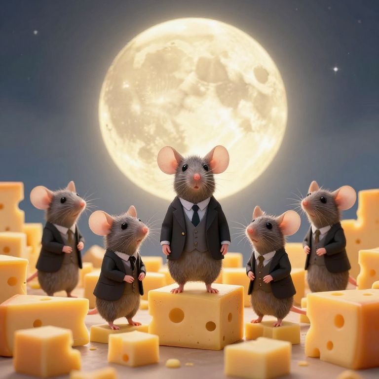 A whimsical assembly of anthropomorphic mice in formal attire stands solemnly before a radiant cheese moon, surrounded by an abundance of perfectly cubed cheese blocks, defying the mundane laws of nature and expectation.