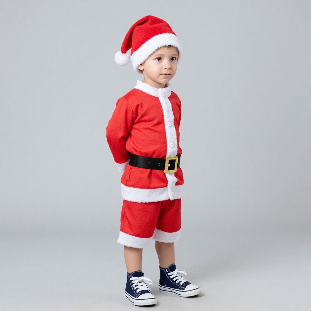 Photograph of a young boy in a red Santa outfit with white trim, black belt, and black sneakers, standing against a plain white background.