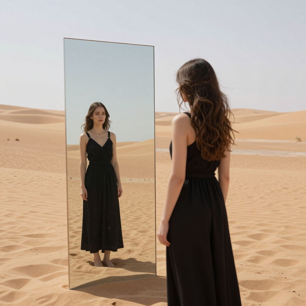 In a vast desert expanse, a woman stands before a mirror that defies reflection, revealing not her own image, but an alternate version of herself—a surreal doppelgänger standing in a mirrored world where reality bends and possibilities multiply.