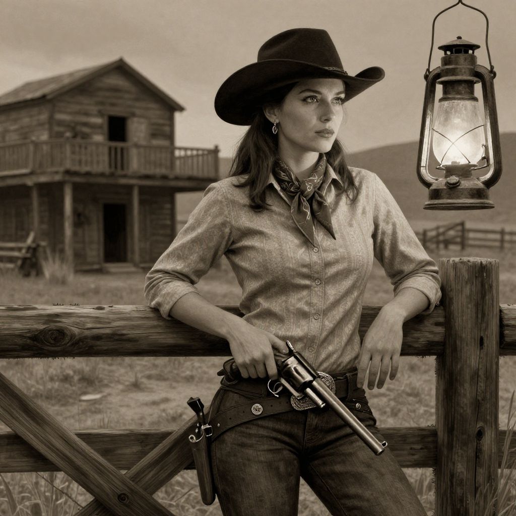 Sepia-toned photograph of a young woman with light skin and dark, wavy hair, wearing a black cowboy hat, light-colored button-up shirt, and dark jeans. She leans against a wooden fence, holding a revolver in her right hand and a holstered pistol on her belt. An antique lantern hangs from the fence to her right, illuminating her serious expression. In the background, an old, wooden, two-story house stands in a grassy, rural setting. The image has a vintage, Western theme, evoking a sense of frontier life.