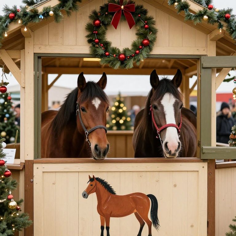 Two horses peek curiously through the open doorway of a festive stall decorated with a wreath and a painted horse motif, showcasing their participation in a Christmas decorating contest.