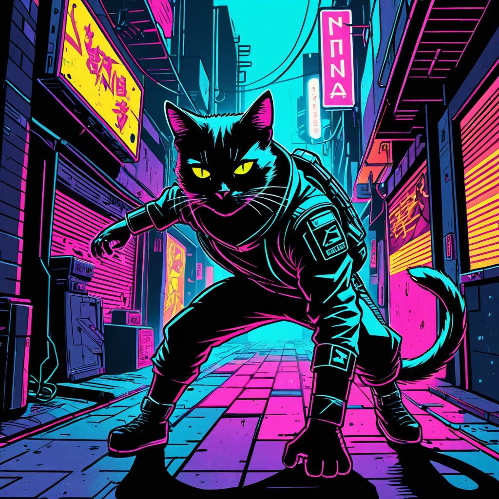 Comic-style illustration with a neon-lit cyberpunk alley, featuring stealthy ninja cat in dynamic shadows, neon highlights, sharp vivid lines. The playful, flirty atmosphere is enhanced by bold shading, energetic vibes, and a high-quality graphic style, perfect for eye-catching artwork.