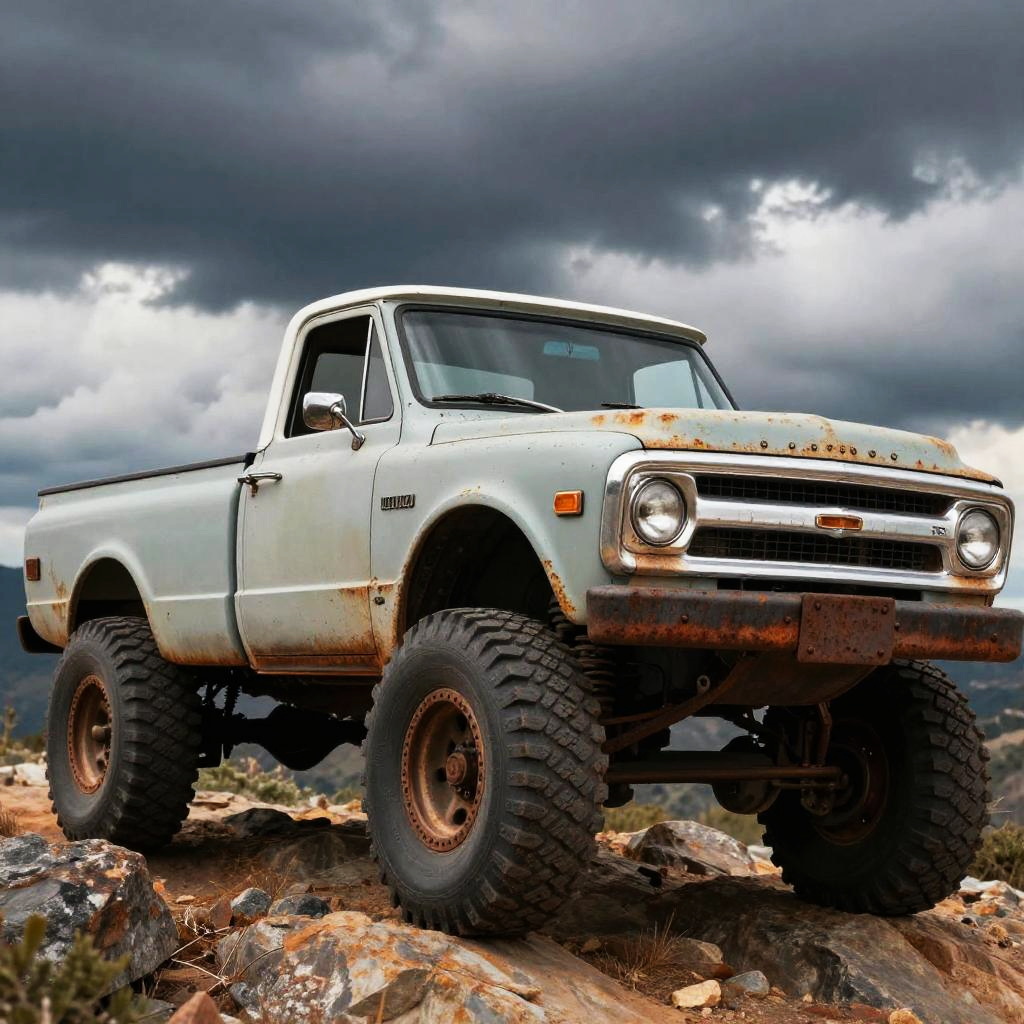 1967 Chevy 4x4 truck, rugged vintage off-road vehicle driving through muddy forest trail, detailed classic chrome grille, large tires covered in mud, sunset lighting, realistic style with a hint of nostalgic warmth, dynamic action scene