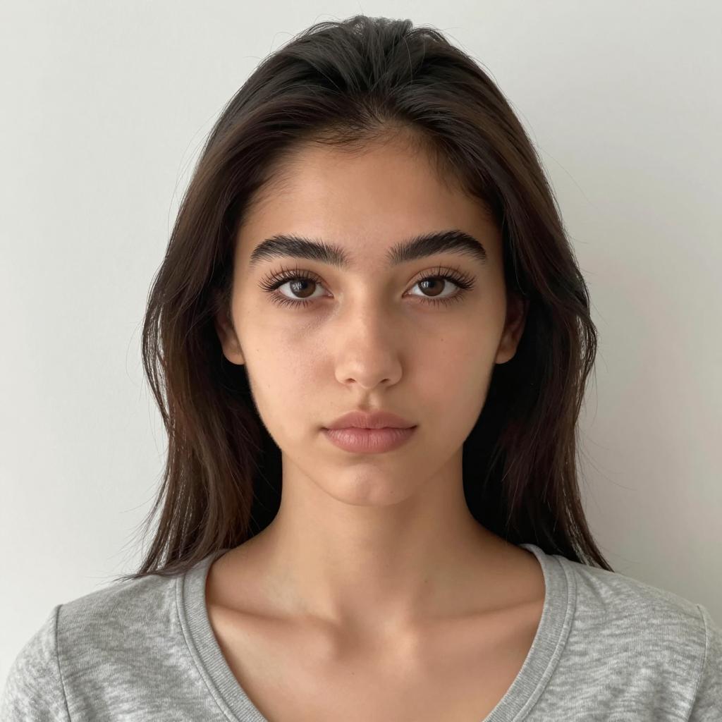 Close-up photograph of a young woman with long brown hair, green eyes, and full lips. She is looking directly at the camera with a neutral expression. She wears a hoop earring in her left ear. Her skin is fair and smooth. The background is a plain, light gray wall. Her hair falls over her shoulders, partially covering her chest.