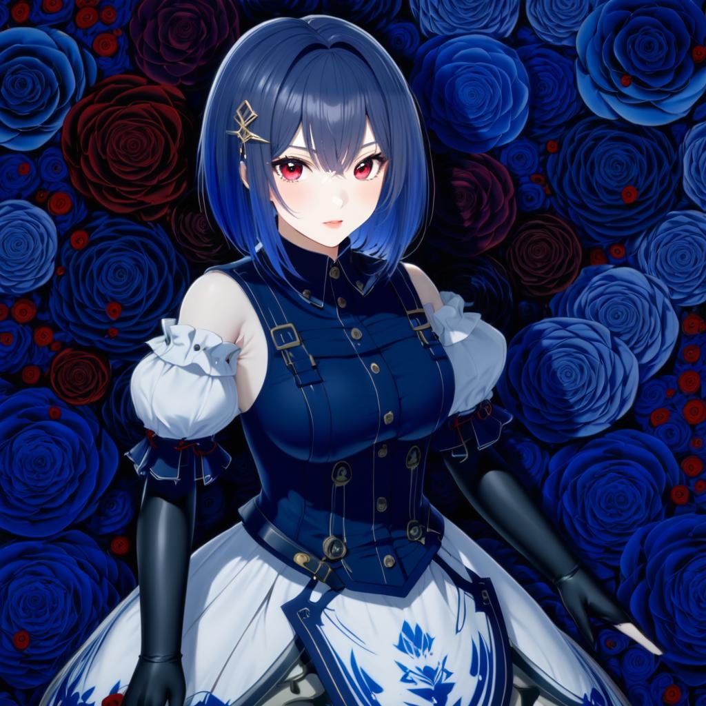 Close-up digital artwork of an anime-style girl with short dark blue hair and striking red eyes. She wears a detailed blue outfit with leather elbow gloves and puffy white sleeves, complemented by a white skirt featuring blue floral designs. Background consists of stylized blue and dark red roses, enhancing the vivid color scheme. Character inspired by the game SinoAlice, in a high-quality anime illustration style.