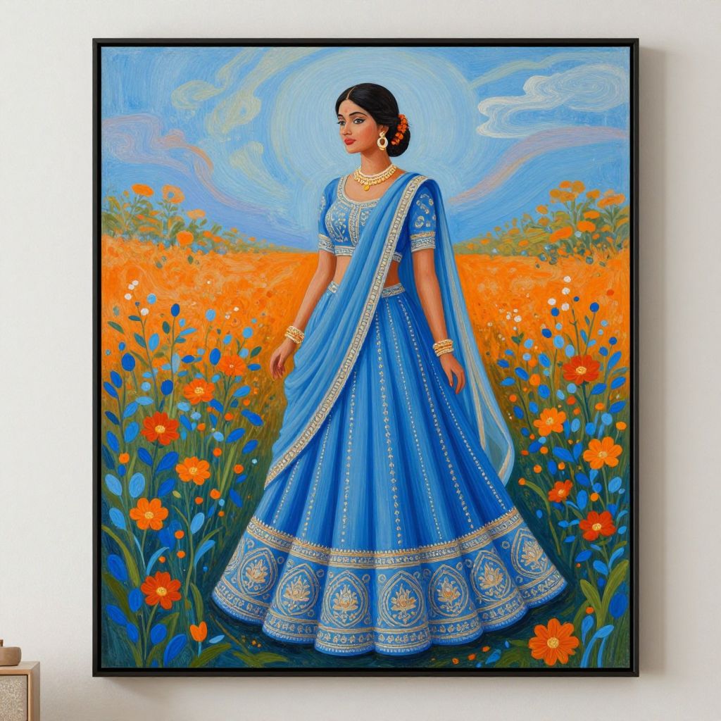 A vibrant figurative acrylic wall painting by an Indian artist, featuring a woman in a flowing blue gown adorned with intricate details, set against a dreamy backdrop of orange and blue floral fields, capturing the essence of beauty and elegance in home decor.