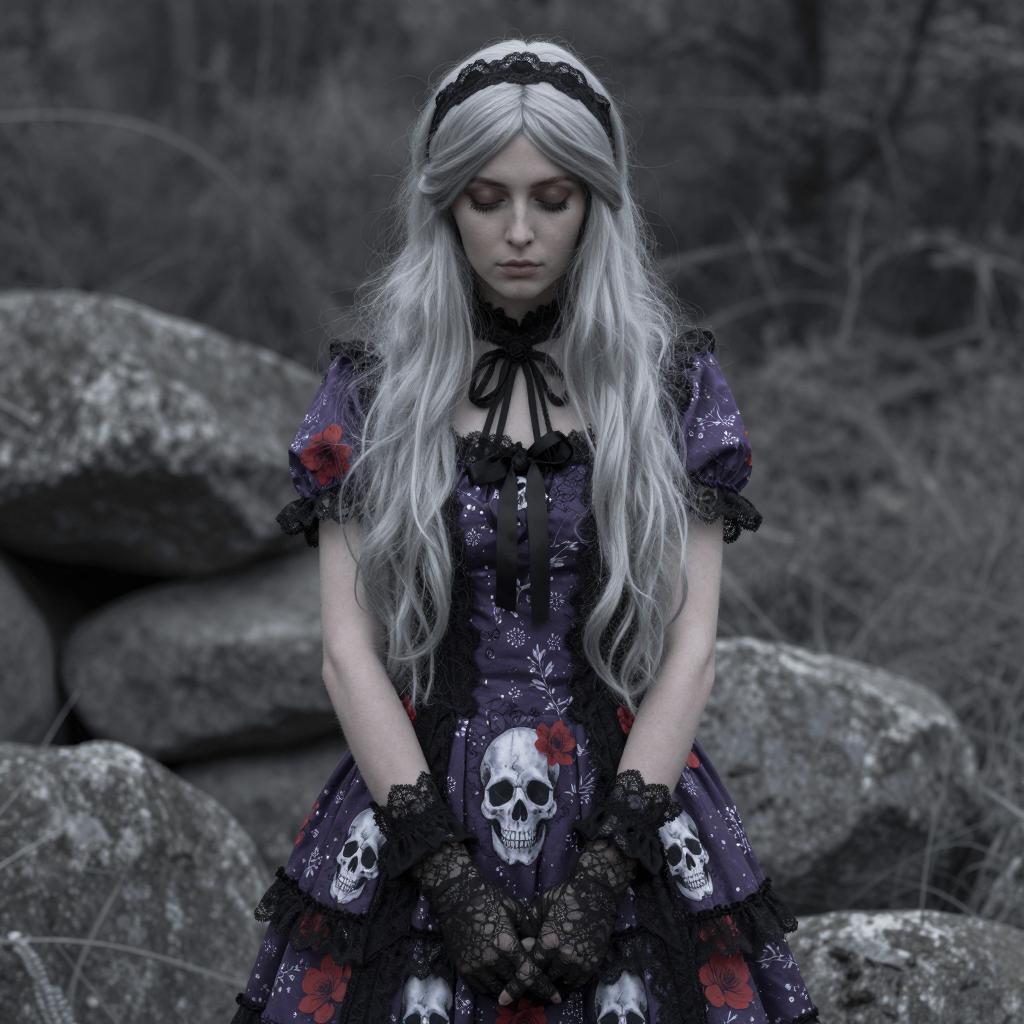 Young woman with pale skin, long platinum blonde hair, and black crown hair accessory, wearing a gray gothic dress with black lace, black stockings, and black boots. She stands in a grassy area against a weathered stone wall with a small bush to her left. Her expression is neutral. The dress has a high collar, long sleeves, and a flared skirt with black trim. She has dark red lipstick and is looking slightly to the left. The visual style is a realistic photograph.