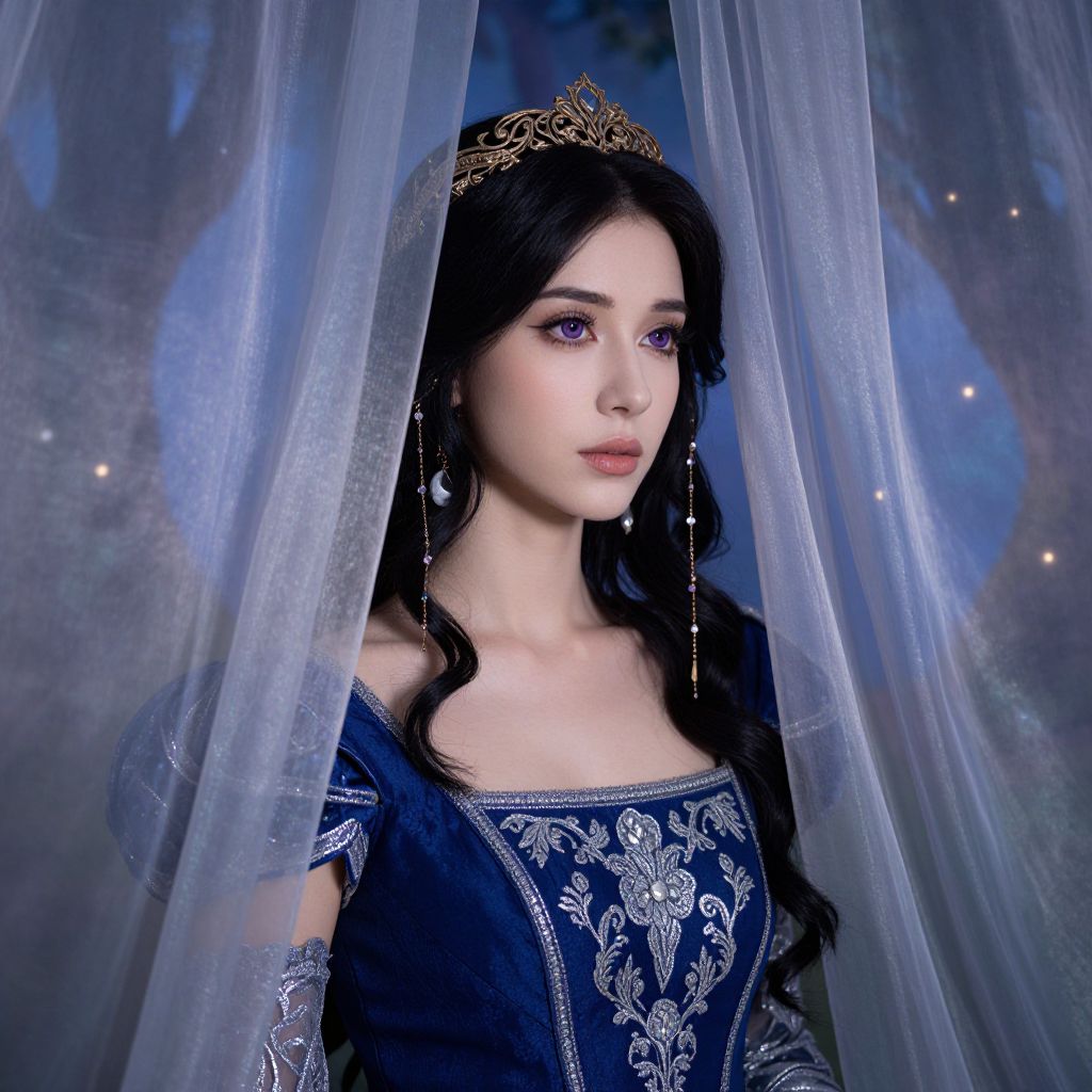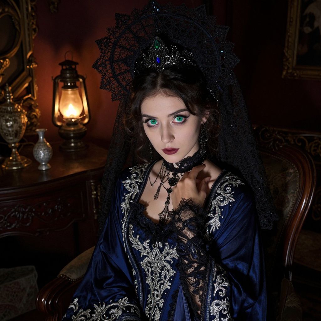 An iPhone portrait captures an explicit fortune teller with piercing emerald eyes and a flowing midnight blue robe adorned in intricate silver embroidery. She sits in a dimly lit Victorian parlor filled with antique curiosities, her expression one of both curiosity and wisdom illuminated by the warm glow of an oil lamp. The dramatic shadows cast across her face enhance the atmospheric scene, offering a unique 'bug's-eye view' perspective through delicate lace adorning her intricate headdress. This captivating portrait blends Victorian elegance with Gothic mystique, evoking emotions that alternate between intrigue and contemplation.