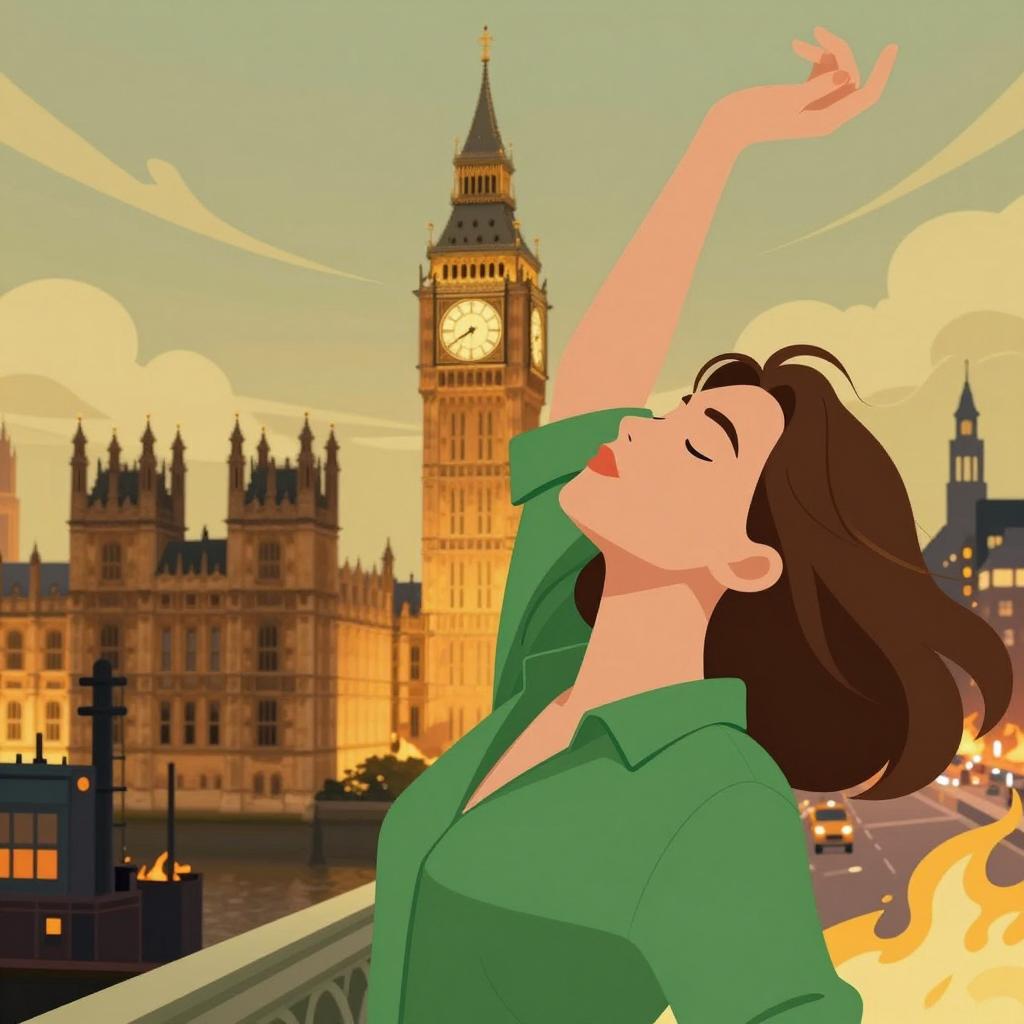 Illustration of a woman with brown hair in a green shirt, head tilted back, eyes closed, arm raised. Background shows a chaotic, fiery cityscape with Big Ben in the center, swirling yellow-green clouds above. Left side has industrial structures. The woman is in the foreground, slightly to the right.