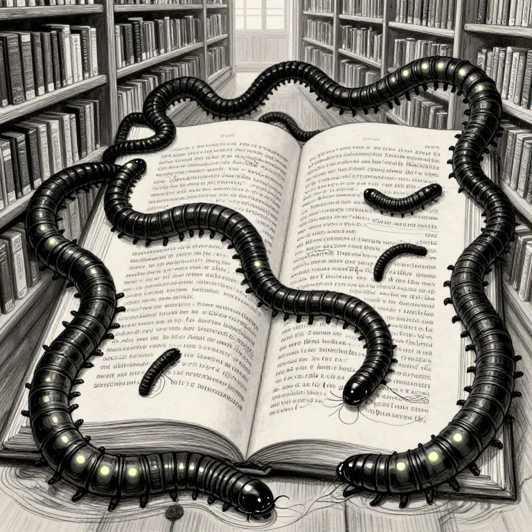 Digital drawing of an open book in a library, surrounded by black, segmented, sinister-looking worms with glowing eyes.