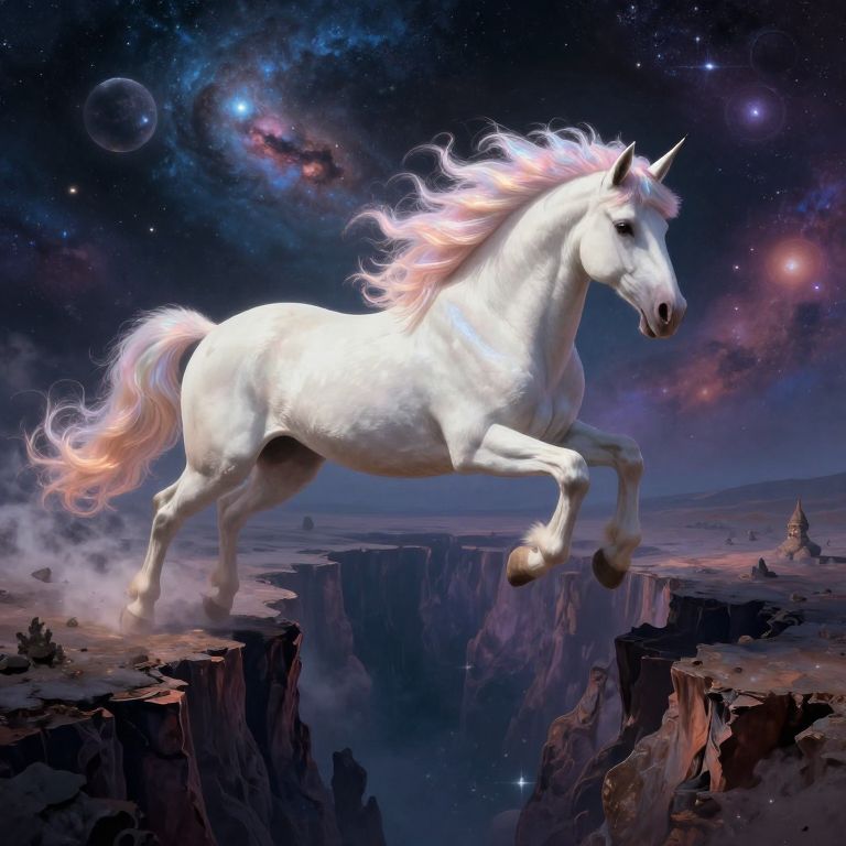Digital artwork of a white unicorn with a glowing horn and rainbow mane, leaping over a deep, rocky chasm under a starry, galaxy-filled