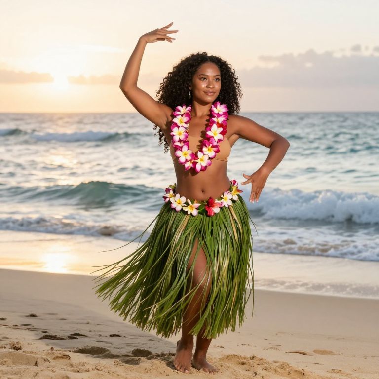 A beautiful Hawaiian hula girl with deep brown skin, natural curly hair, and warm brown eyes, dancing gracefully on a white sandy beach at sunrise, wearing a traditional grass skirt and a flowered lei made of plumeria and hibiscus flowers, the ocean waves gently rolling behind her, soft golden light reflecting off the water, realistic photography style.