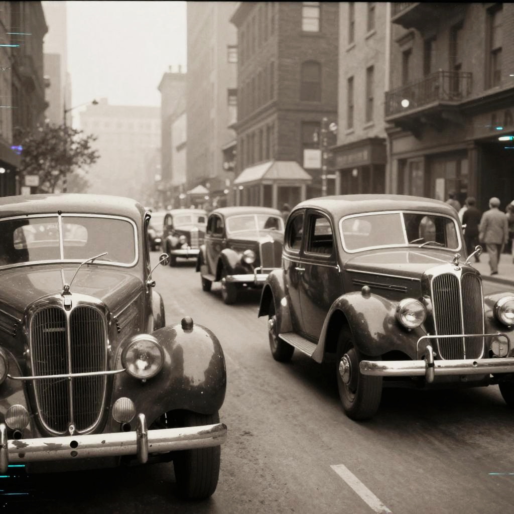 Old photo restoration showing a faded historic street scene with buildings and vintage cars, retouched with sharp clarity, balanced contrast, and warm colorization to bring life to the aged photograph.