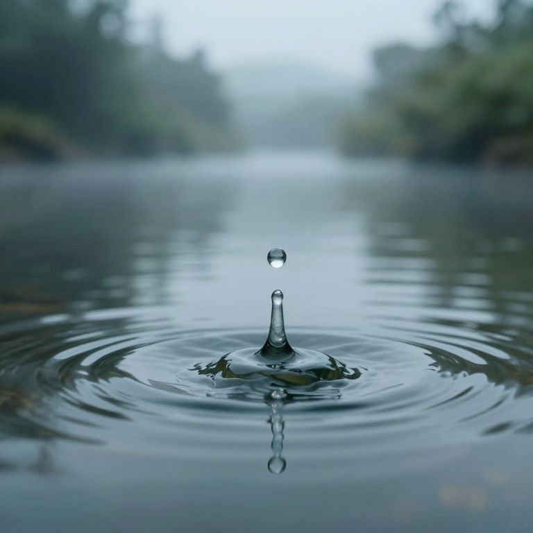 A serene, high-definition digital artwork captures a teardrop suspended mid-air above a tranquil river, creating a mesmerizing cascade of concentric ripples that mirror its descent, evoking a timeless, reverse-motion effect in a misty, natural setting.