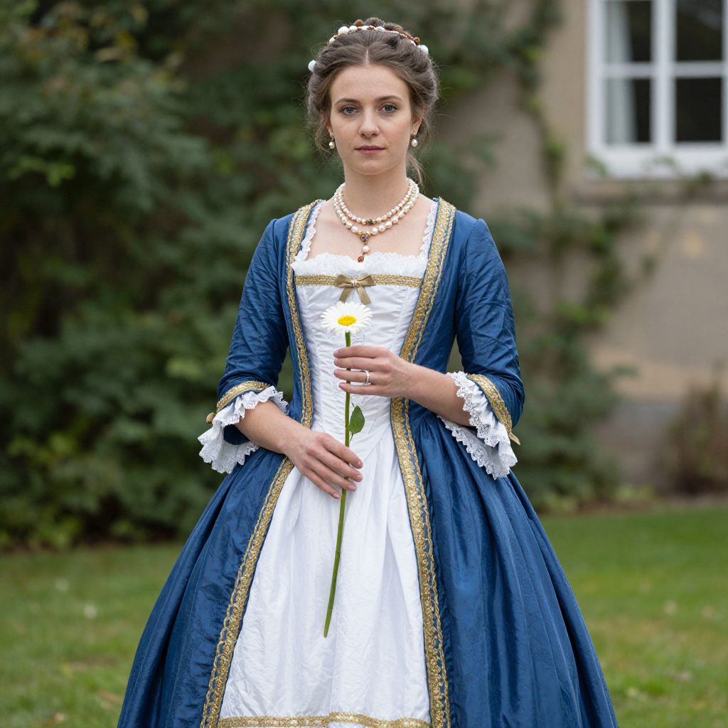 French costume, woman in blue dress with gold trim and white dress holding a flower