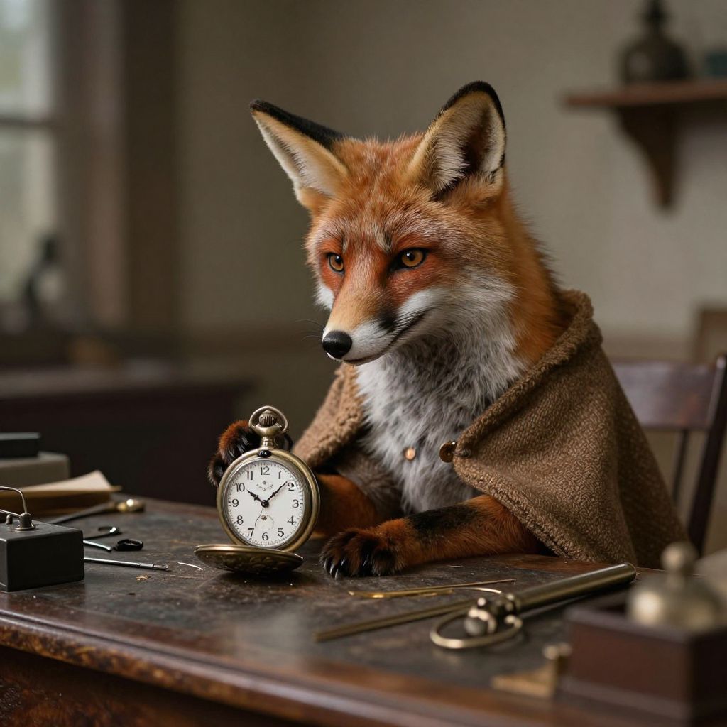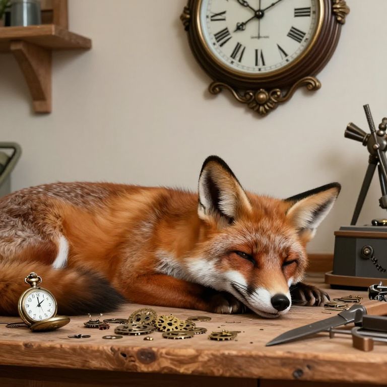 Fox asleep at a wooden workbench, surrounded by intricate clock parts and tools, with a vintage pocket watch and ornate wall clock above, as its subconscious is gently soothed by the rhythmic ticking of time.