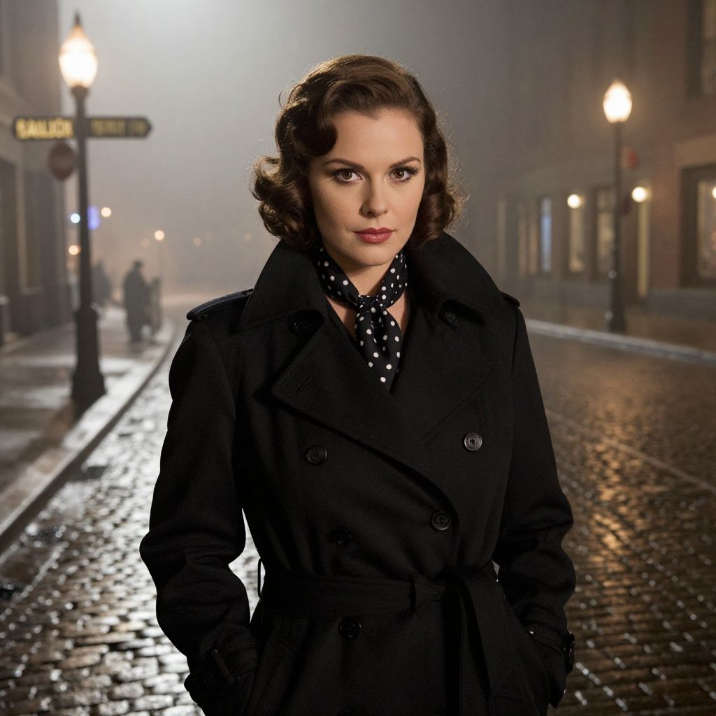 Cinematic photo of a 1930s detective woman with deep brown eyes, a defined chin, and a calm but calculating expression, standing in a foggy urban street at night, wearing a classic black trench coat with a high collar and a small scarf, the city lights reflecting off wet cobblestones, the background showing vintage street signs and a gas lamp, classic noir mood with atmospheric depth.. The woman has big tits and cute face