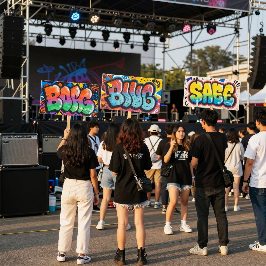 Creative concert signs blending street art and pop culture elements, painted with bold graffiti style, held up by stylish young concertgoers at an open-air rock concert, late afternoon light casting long shadows, vintage amplifier stacks and large speaker arrays framing the stage.