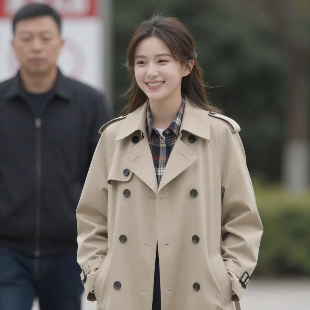 Photograph of a smiling young woman with fair skin and brown hair, wearing a beige trench coat over a plaid shirt. She stands with hands in pockets, slightly turned to the right. A man in a black jacket is blurred in the background, with greenery and a sign partially visible behind her.