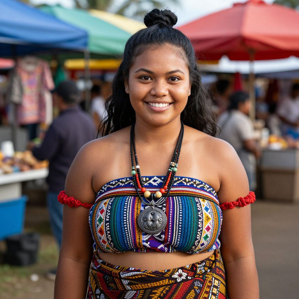 A young Samoan woman in a vibrant Samoan costume, wearing a patterned sarong, traditional pendant jewelry, and a decorated top with woven motifs, standing in a traditional village market with bright market stalls, her face showing a joyful expression, deep brown eyes, and long black hair tied in a traditional knot, with warm sunlight reflecting off the traditional fabrics. The woman has big tits and cute face