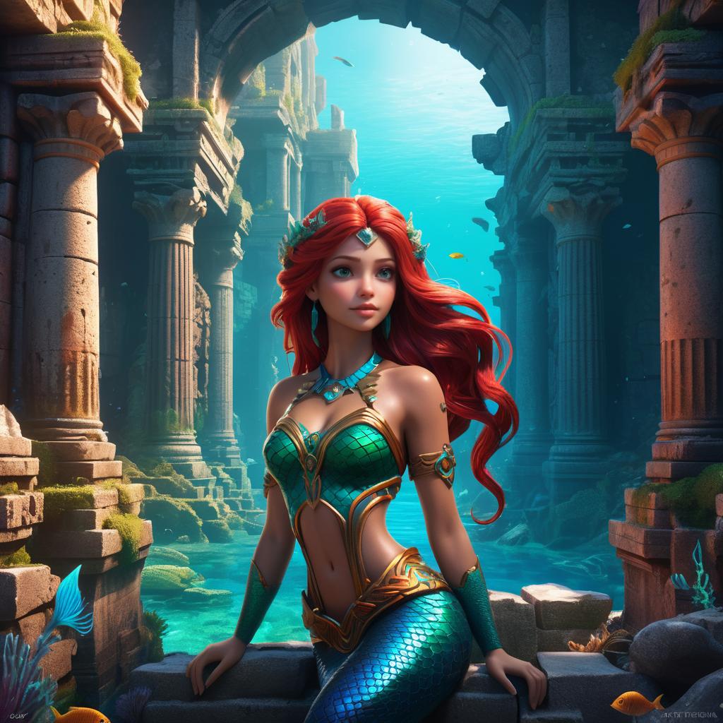 A detailed digital depiction of a mermaid with red hair and a turquoise scaled tail, sitting on a stone ledge within ancient underwater ruins. The scene features tall, moss-covered stone columns and corals, illuminated by sunlight filtering through the water. The mermaid wears a decorative golden corset and arm bands, enhancing the fantasy theme.