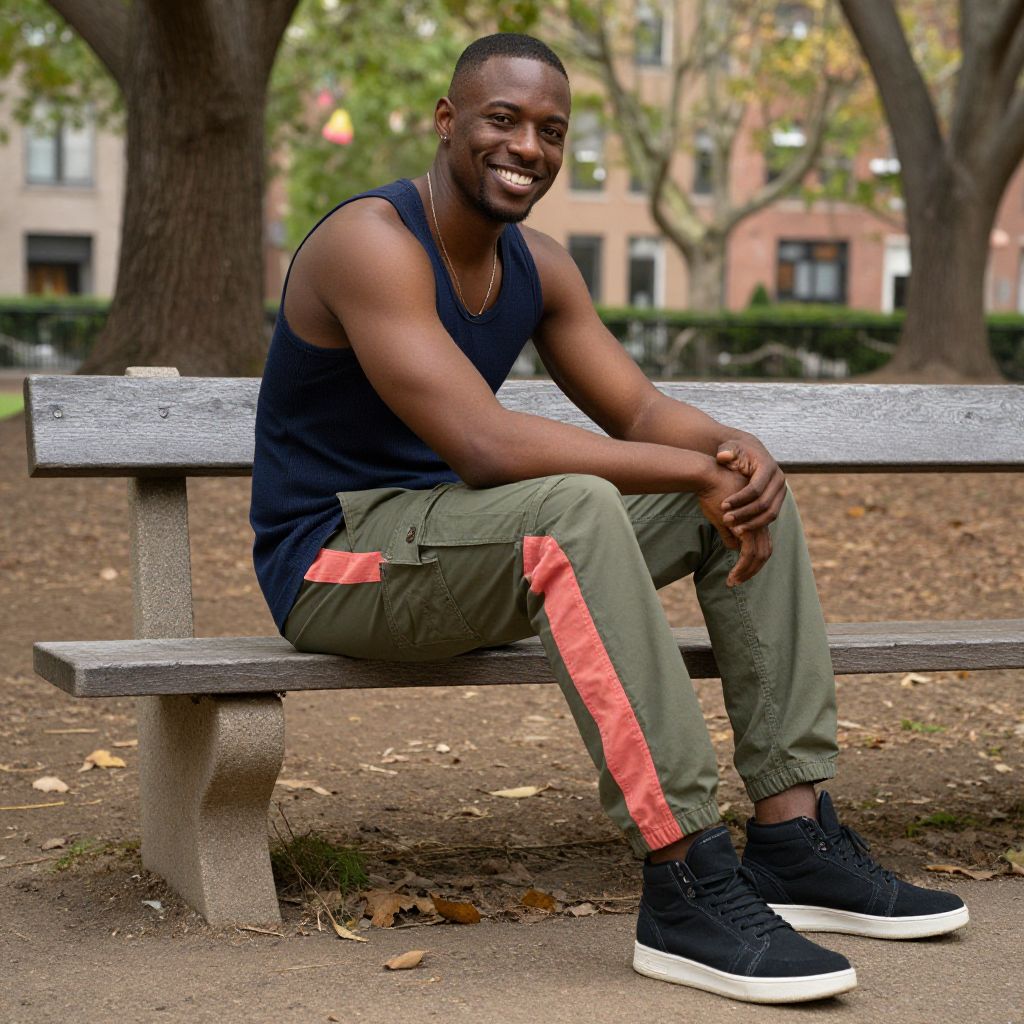 A stylish outdoor lifestyle photo of a tall, athletic man with dark brown skin and a friendly, smiling face wearing cargo pants with a coral stripe running diagonally from top left to bottom right, sitting on a park bench in a tree-lined neighborhood with autumn leaves beginning to fall around him.