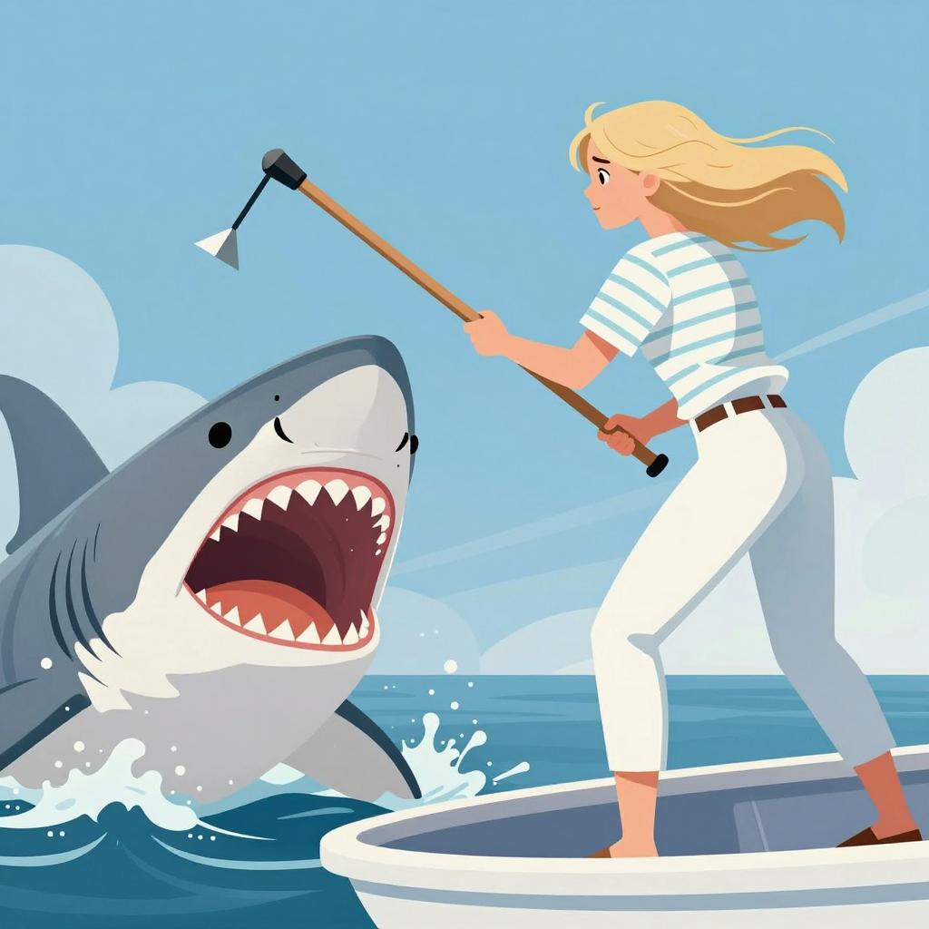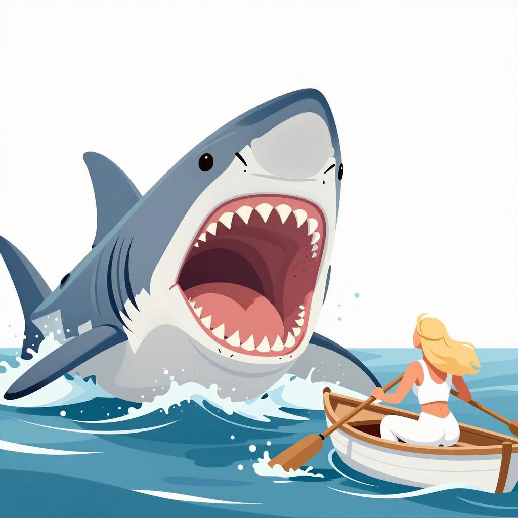 Illustration of a blonde woman in a yellow bikini standing in deep blue ocean water, holding a fishing rod. Large shark with open mouth and sharp teeth rises from water behind her. Shark's mouth is centered, taking up most of the background. Woman's right arm is extended slightly backward, left arm is at her side. Water splashes around her legs. White background surrounds the scene.