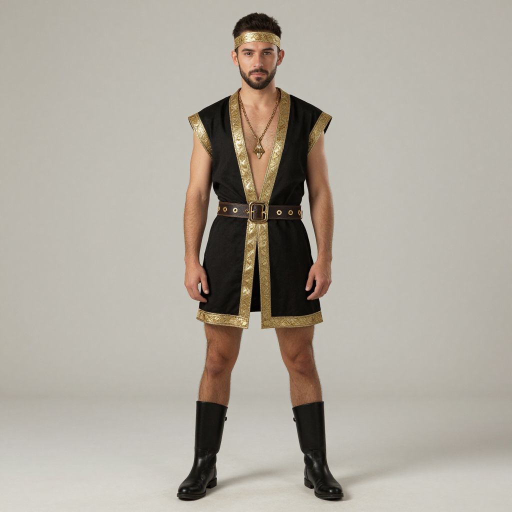 Photograph of a bearded man in a black and gold gladiator-style outfit with a headband, necklace, belt, and black boots.