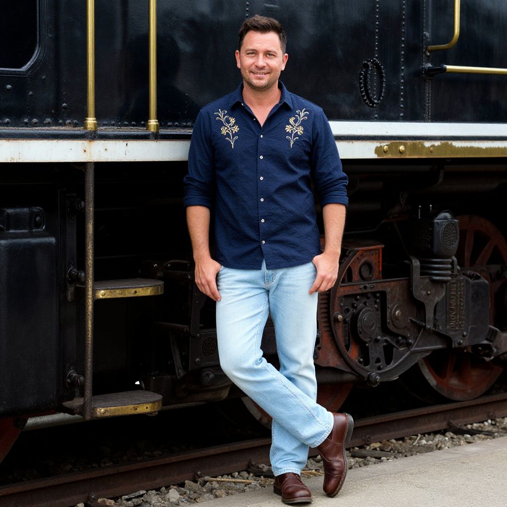 A man, navy blue embroidered chambray shirt, light wash jeans, vintage brown leather boots, standing by vintage locomotives, polished brass fittings, technicolor analog film stock, relaxed smile, exuding comfort and style. Man has masculine face and piercing eyes
