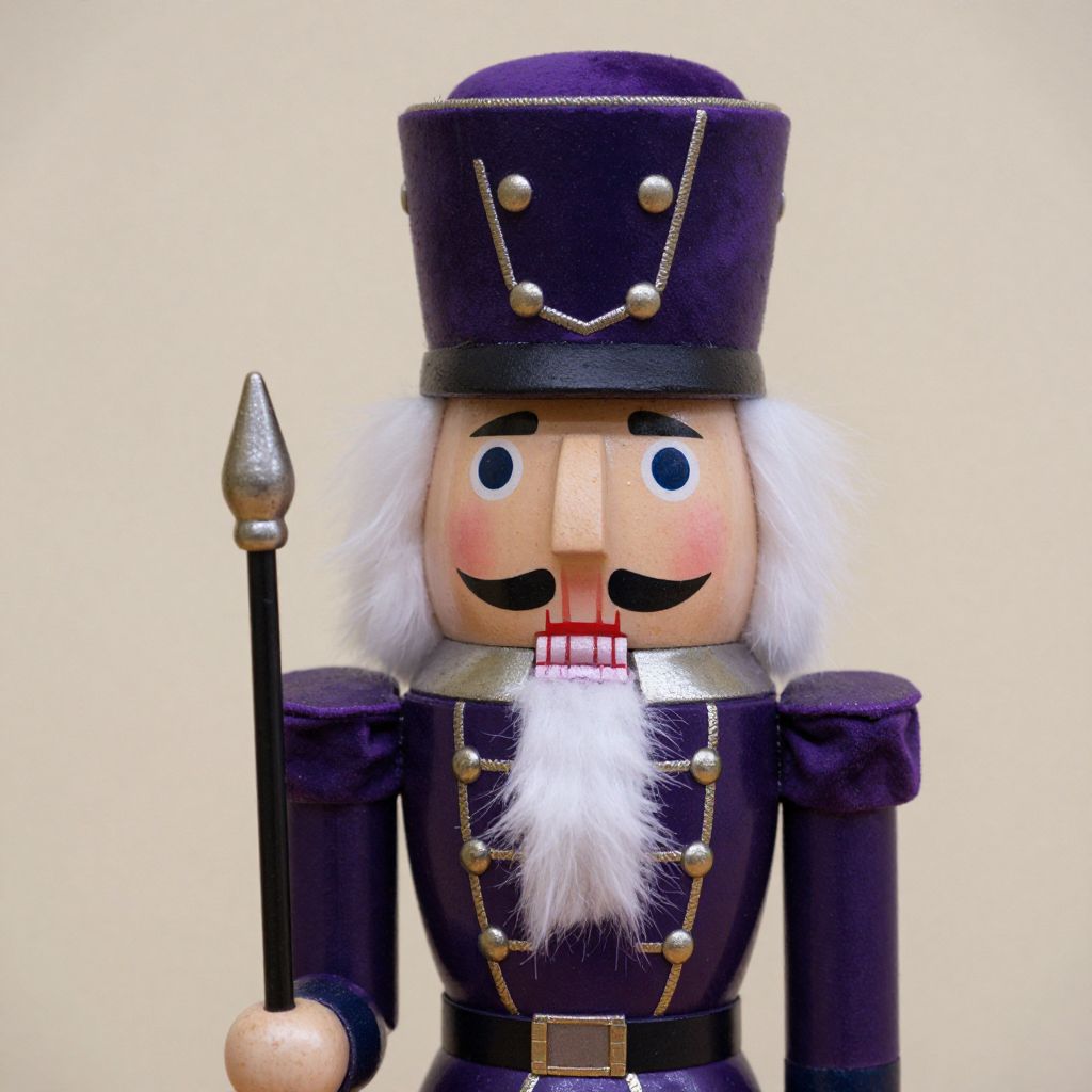 Photograph of a traditional wooden nutcracker soldier with a black hat, purple uniform, white beard, and holding a spear, set against a plain
