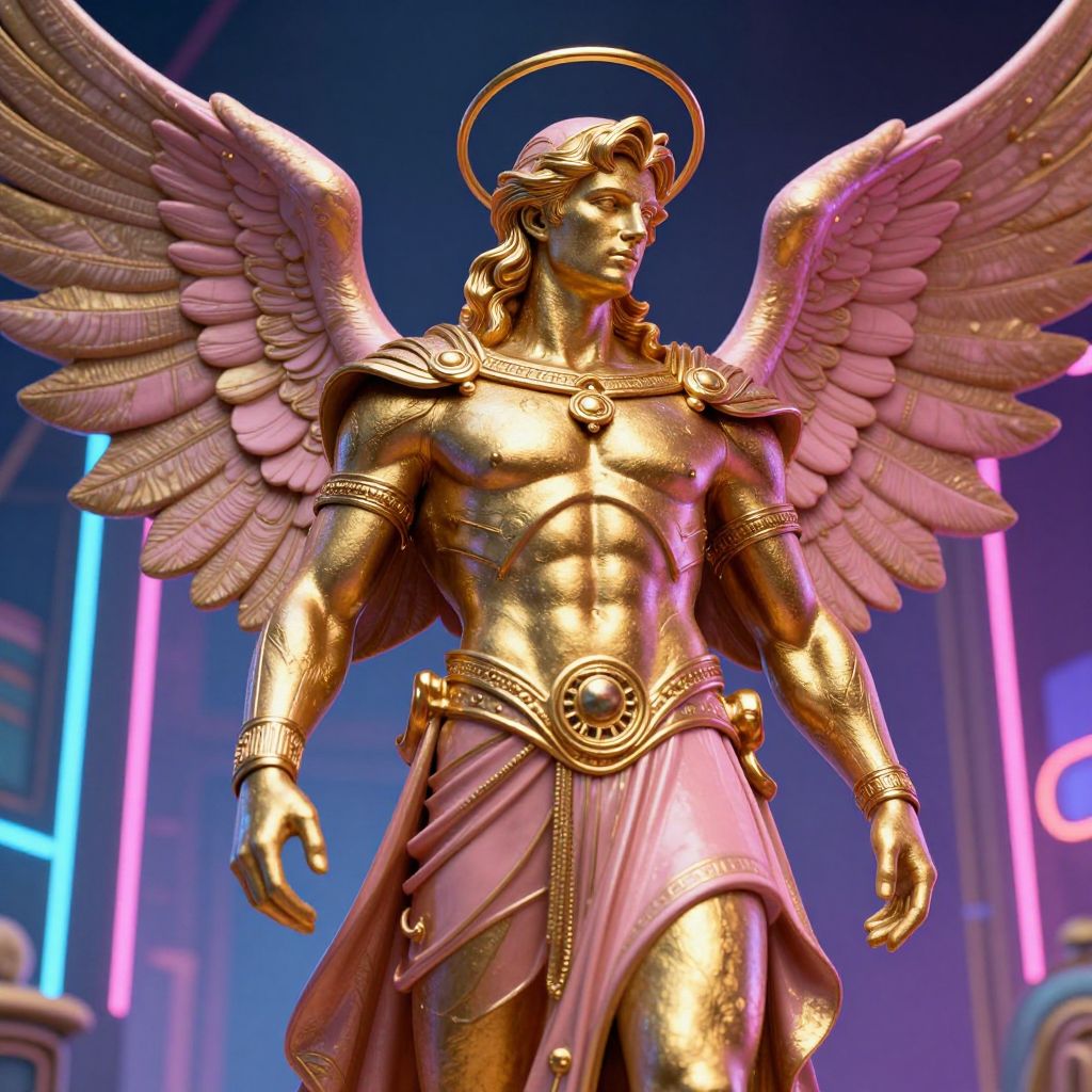 Gilded angel statue with large pink wings, golden armor, and pink draped cloth, standing in a neon-lit futuristic background.