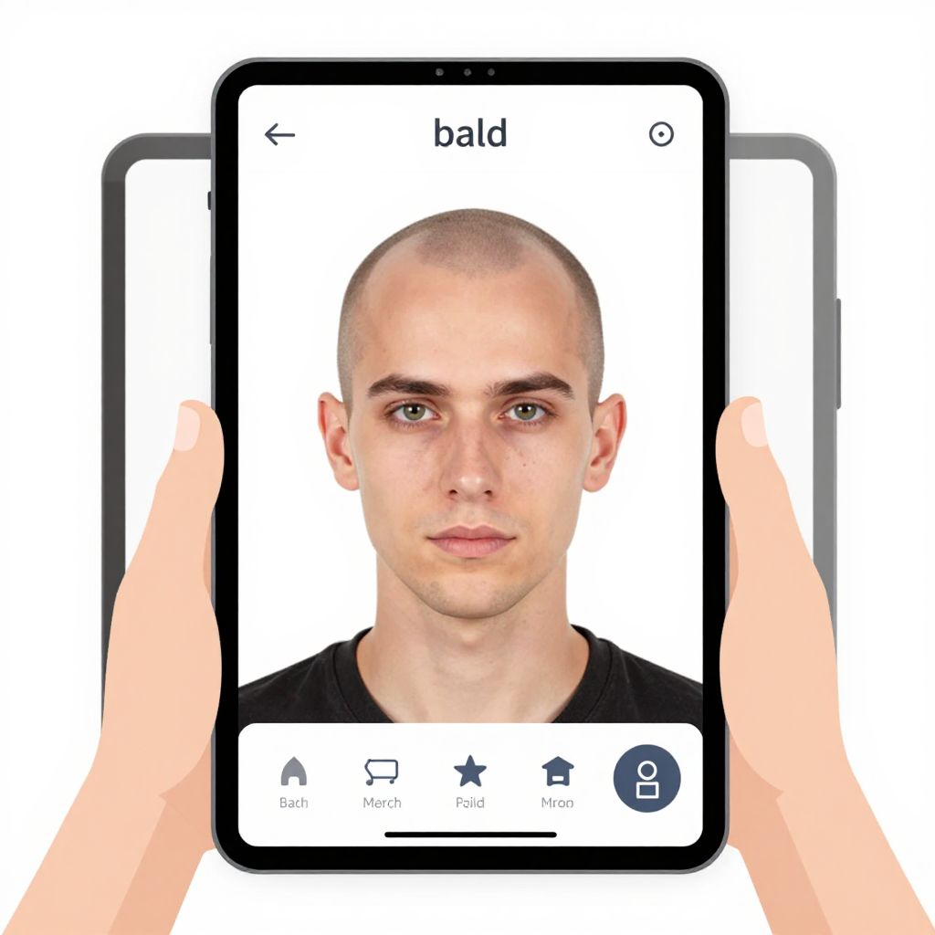 Make me bald online free, illustration of a tablet or smartphone display with a bald hairstyle filter applied on user photo, modern app interface, minimalistic design, bright and clean background, step-by-step demonstration, clear visuals for virtual grooming.