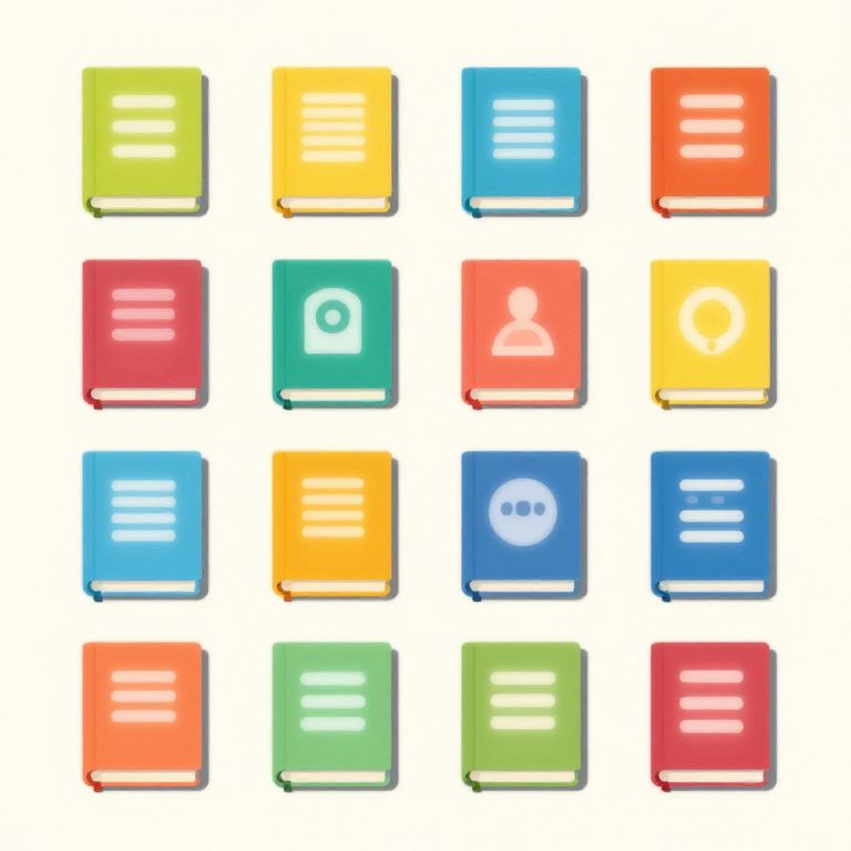 This is a digital illustration of a 4x4 grid of colorful, rectangular icons resembling small notebooks or cards. Each icon is a different vibrant color, including green, yellow, blue, red, orange, teal, and purple. Some icons have white text or symbols, such as lines, a circle with a dot, or a user silhouette. The icons are evenly spaced against a plain white background, creating a clean and organized appearance. The overall style is modern and flat, with a bright and eye-catching design.