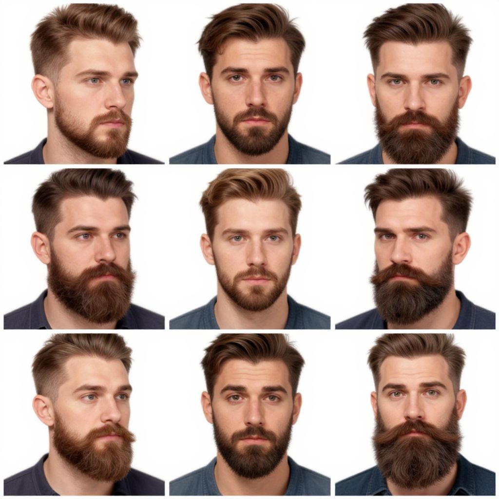 How to pick a beard style, creative montage of beard styles on various male models, including short boxed, goatee, and full beard, vibrant and realistic rendering with focus on texture and grooming details, educational and stylish look.