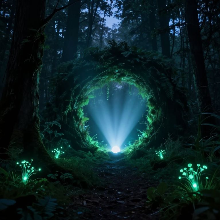 Superbrightlights streaming from a magical portal in a forest clearing at dusk, bioluminescent plants glowing softly around, mysterious and wonderous atmosphere, fantasy art style, detailed nature elements