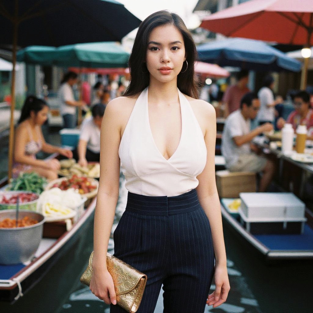 A slim woman in summer attire, wearing a sleeveless halter top and matching navy pinstripe trousers, holding a metallic gold clutch, captured in the visual style of 3M Ferrania analog film stock, standing in a vibrant gourmet street food scene at the Bangkok floating market. Sexy. Pretty face and beаutiful eyes. Big breasts