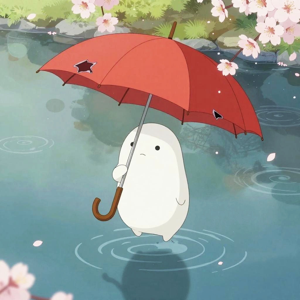 Umbrella yokai with a torn red umbrella, animated style, floating above a tranquil pond with falling cherry blossoms, serene yet haunting vibe, soft pastel tones