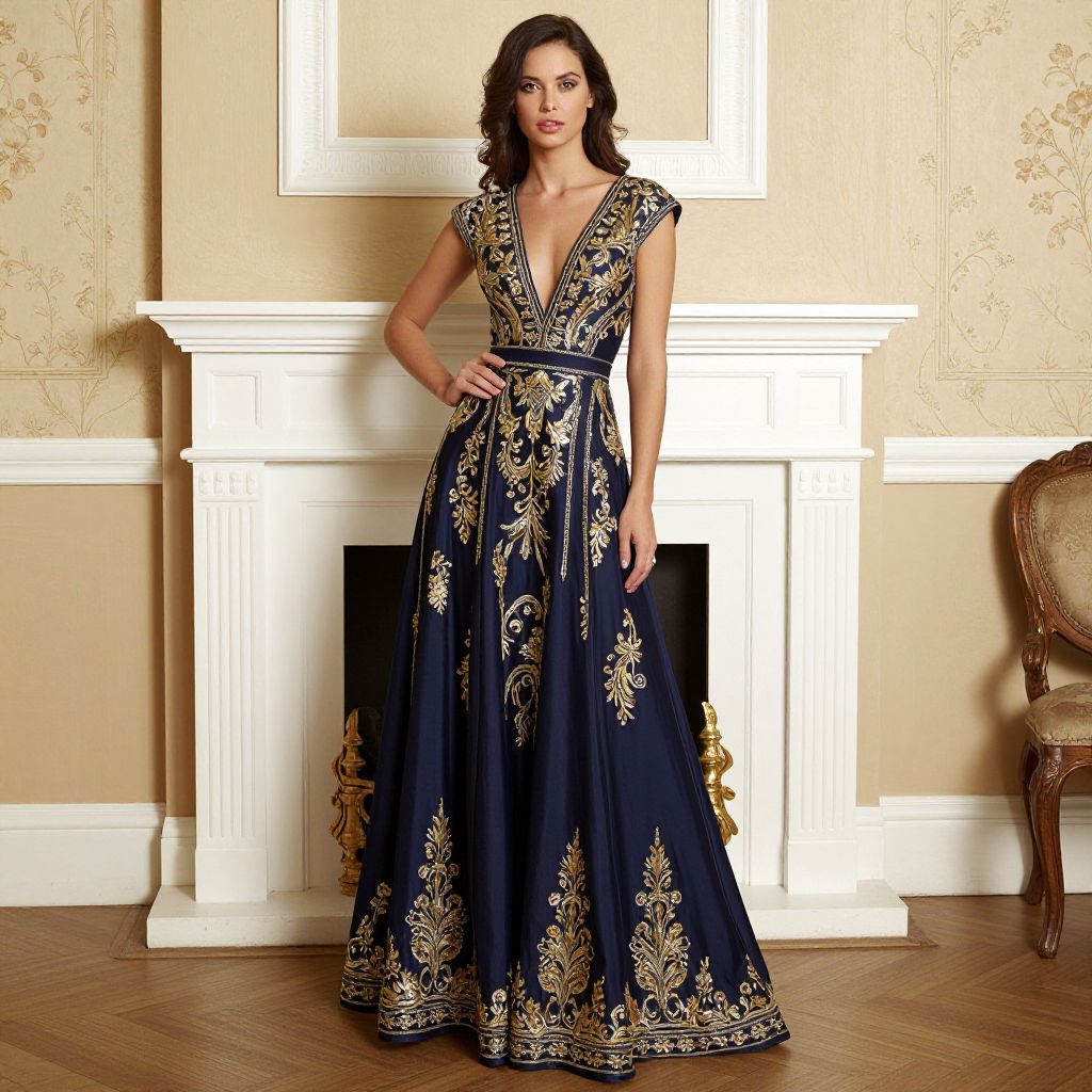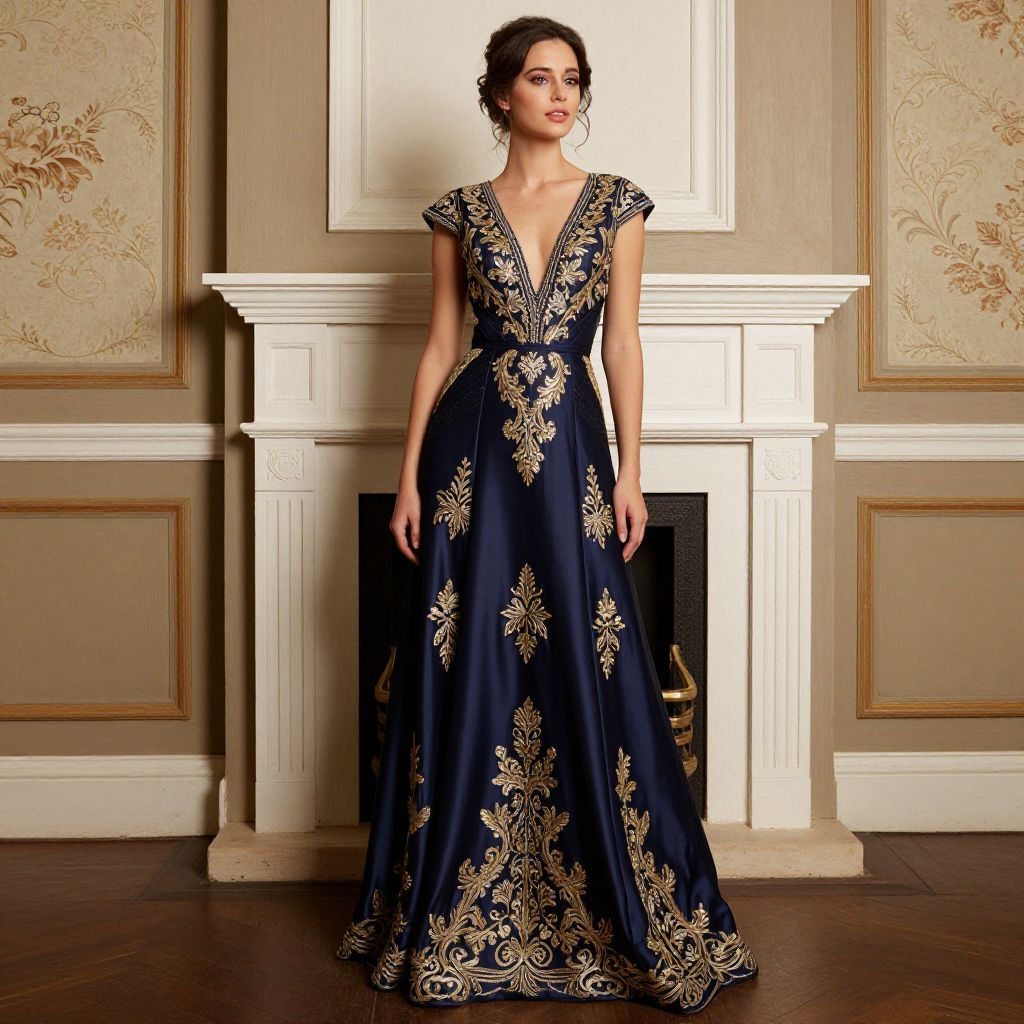 A woman elegantly poses in a luminous navy gown adorned with intricate gold embroidery, set against a vintage-inspired backdrop featuring a classic white fireplace and floral wallpaper, captured in high-definition detail with dramatic lighting that enhances the gown's luxurious texture and the room's refined ambiance.